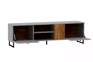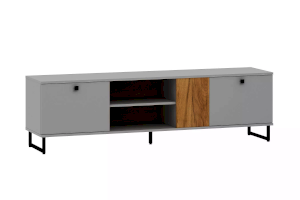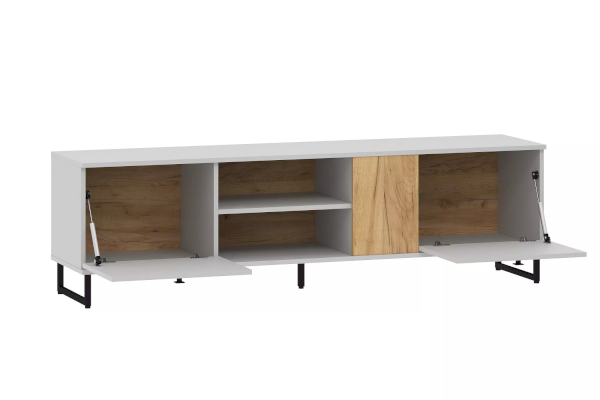 Тумба оснащена открытой нишей и двумя полками, в которых можно удобно разместить видео- и аудиоаппаратуру или предметы интерьера.