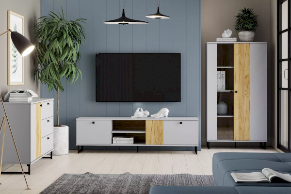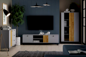 Коллекция БРУНО – это современный дизайн с характером, который отлично впишется в стиль лофт. Цвет платиново-серого и золотого дуба гармонично подчеркнут контрастными черными ручками и черными металлическими опорами.