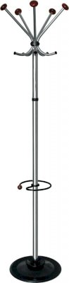 Офисная вешалка напольная на 5 крючков. Снабжена подставкой для зонтов. Утяжеленное двойное основание. Выполнена из оцинкованной стали с полимерным покрытием. Штанга из зеркальной нержавеющей стали. Декоративные наконечники (шары) – натуральное дерево.