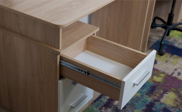 Стол письменный – удобное рабочее место для студента, школьника, отличное решение для кабинета с интерьером в скандинавском стиле. В столах системы Гарвард мягкие, удобные для опирающихся рук края, с кромкой в 2мм, а также, скруглённые углы столешницы. Корпус выполнен в теплом древесном цвете светлого дуба с приятной на ощупь фактурой, фасады - белые матовые. Нейтральные оттенки мебели позволяют легко вписаться уже в готовый интерьер.