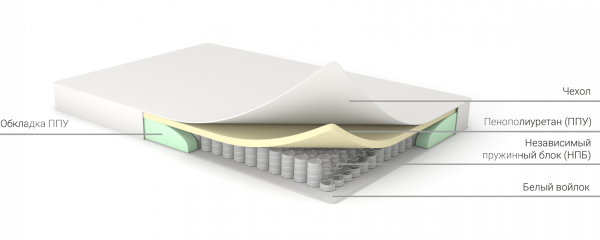 Независимый пружинный блок (НПБ): уникальность независимого пружинного блока в том, что каждая пружина в нем работает отдельно от других, поэтому движения одного спящего не побеспокоят даже самый чуткий сон другого. Независимый пружинный блок обладает уникальными ортопедическими свойствами и делает положение тела вовремя сна максимально комфортным. Рекомендован для снятия усталости и болей в спине.