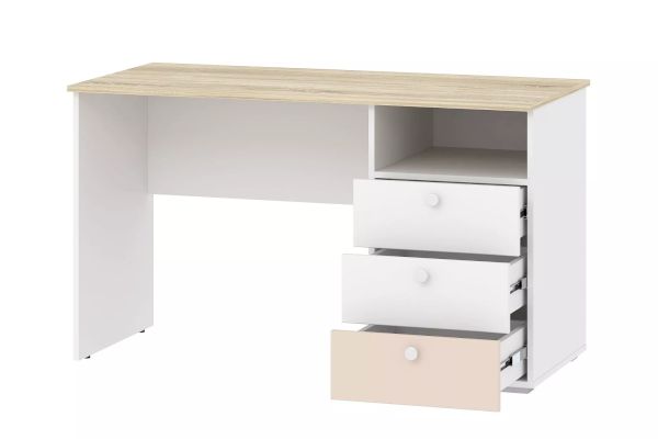 Данная модель дополнена небольшим модулем из трех выдвижных ящиков и открытой ниши. Вместительная полка под рабочей поверхностью прекрасно подходит для книг и тетрадей. Ящика с удобными ручками легко выдвигаются, предоставляя полный доступ к содержимому и позволяя быстро найти необходимый предмет. Скругленные ручки-кнопки  не имеют острых граней.