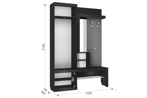 «Алекс» - прихожая 3 в 1. Это открытые ниши для размещения одежды, сумок на металлические крючки и модное решение из хромированных трубок для хранения повседневной обуви.  Закрытый шкаф-гардероб для несезонной обуви и верхней одежды на плечиках. А так же ниша-трюмо с зеркалом и полками сбоку станут незаменимыми помощниками в наведении  утреннего марафета. В закрытом шкафу под зеркалом можно хранить средства для чистки обуви, фен и другие нужные вещи. Прихожая «Алекс» - в ней поместится ВСЕ и даже Больше!